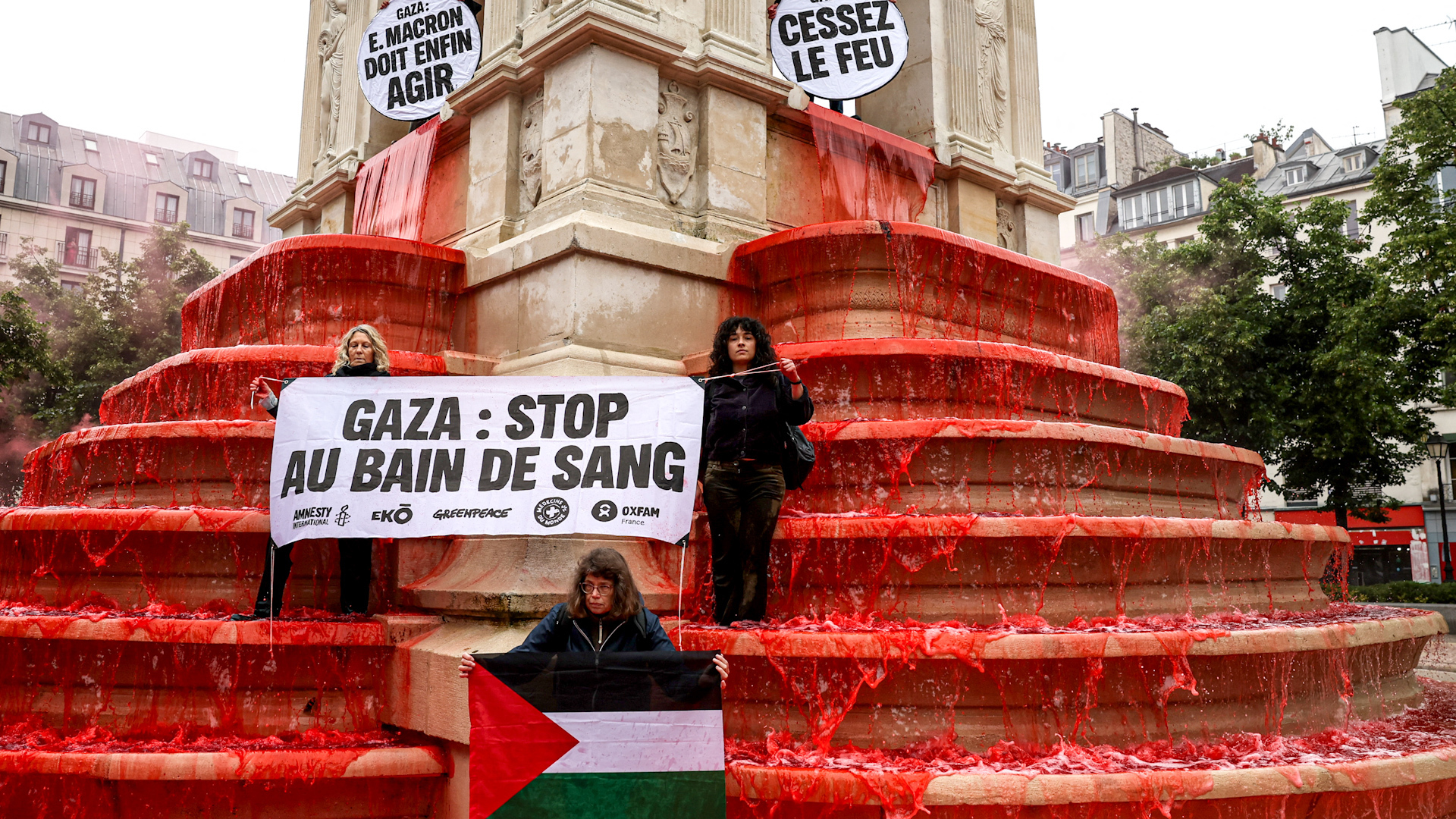 Activists in Paris dyed a fountain red to symbolise what they called “the bloodbath” taking place in Gaza. The protesters said a lack of political will to confront Israel’s actions in Gaza was increasingly being seen as “a form of complicity” with genocide.