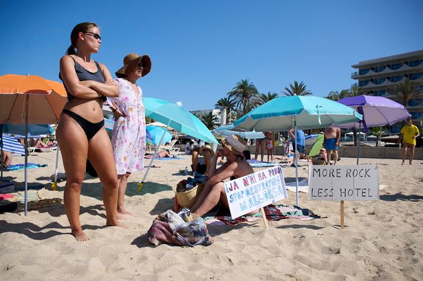 Members of the Mallorca Platja Tour association place signs against tourist saturation on the beach of Palma de Mallorca. New laws are cracking down on bad tourist behavour(Image: Getty Images)