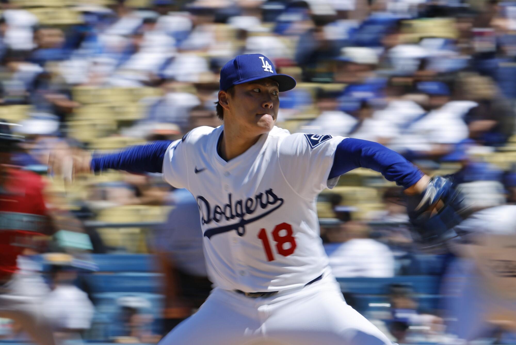 Dodgers pitcher Yoshinobu Yamamoto delivers during the fourth inning Sunday against the Diamondbacks.
