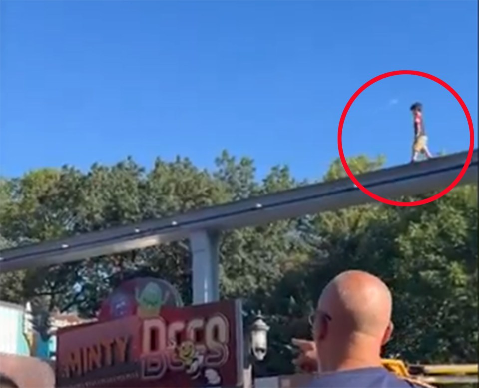 THIS is the heartstopping moment when a child walks 100ft up along a holiday park monorail track.