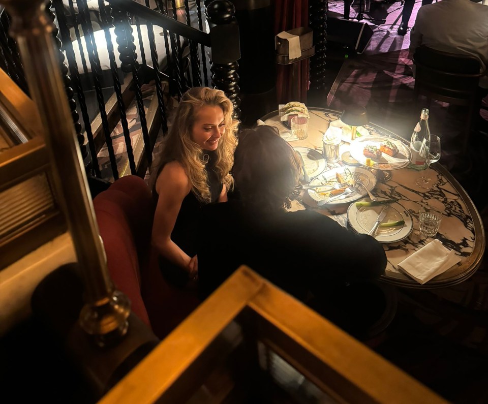 An onlooker saw the tattooed telly star romancing the woman at The Maine Mayfair over a posh dinner.