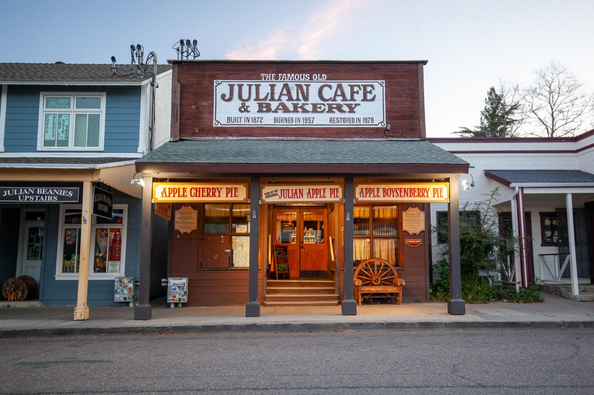 In early spring, the California mountain town of Julian sits suspended between seasons. At more than 4,000 feet, up in the Cuyamaca Mountains, it rests among coastal live oak woodlands and Coulter pine forests. Snow sometimes dusts the surrounding slopes, melting by afternoon into damp earth as manzanita and mountain lilac begin to flower. Along Main Street, the mingled scents of woodsmoke and apple pie drift from storefronts.