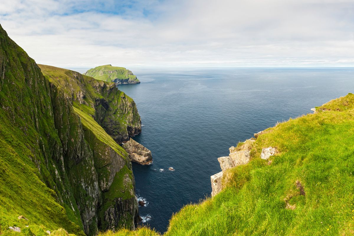 The tallest and most dramatic cliffs in the UK can be found on the spectacular archipelago of St Kilda which is in the North Atlatnic Ocean and is 100 miles off the Scottish mainland