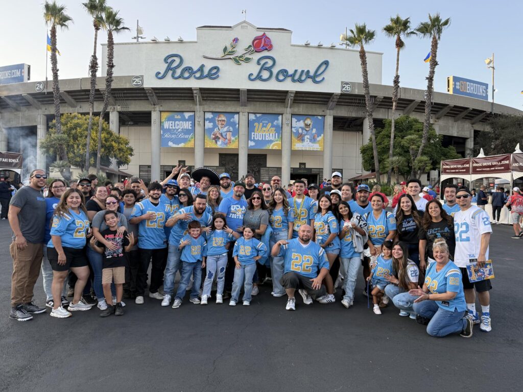 UCLA running back Anthony Frias II’s family gathers for a photo in front of the Rose Bowl before cheering for him and the Bruins.