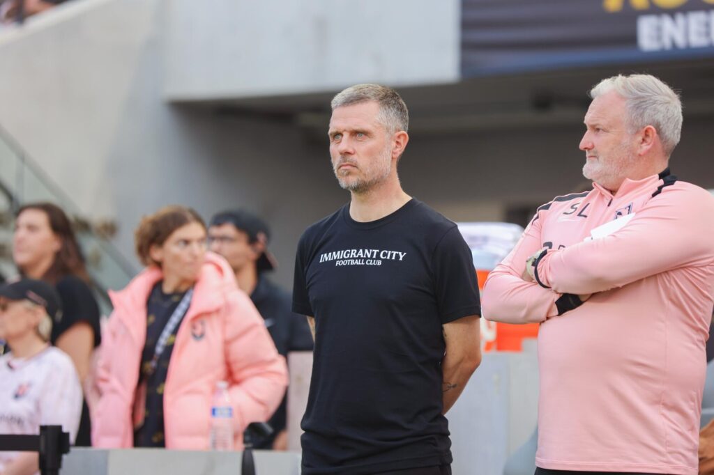 Angel City coach Alexander Straus wears a shirt with the words, “Immigrant City Football Club” before Saturday’s match.