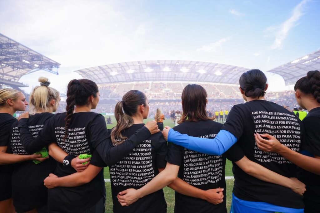 Angel City players lock arms while standing for the national anthem. Their shirts read “Los Angeles is for everyone.”