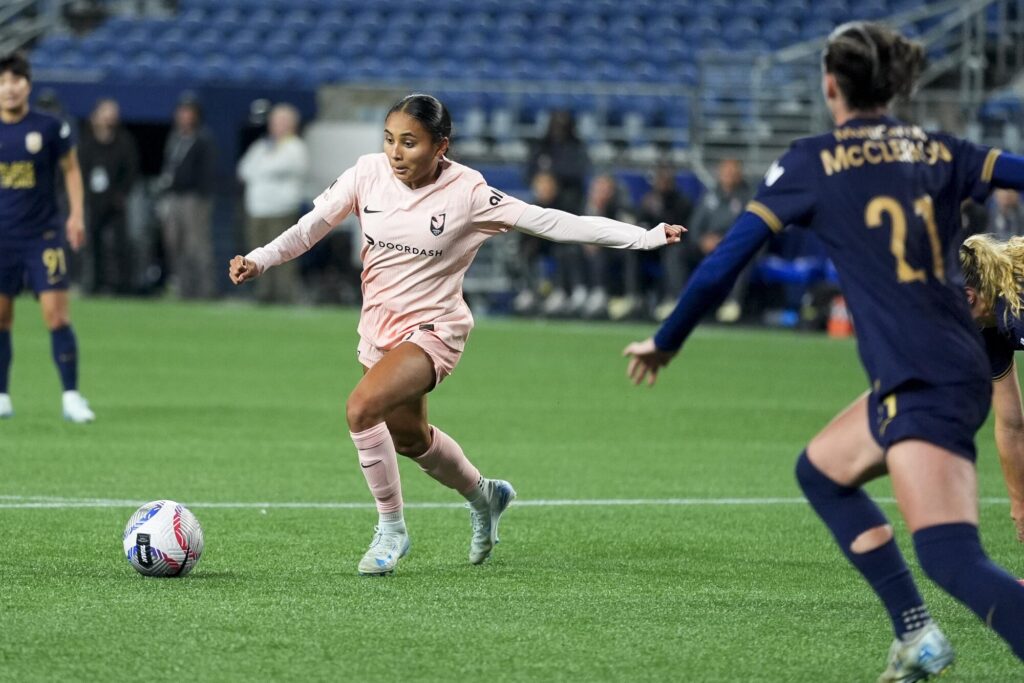 Angel City forward Alyssa Thompson controls the ball during a match against Seattle in October.
