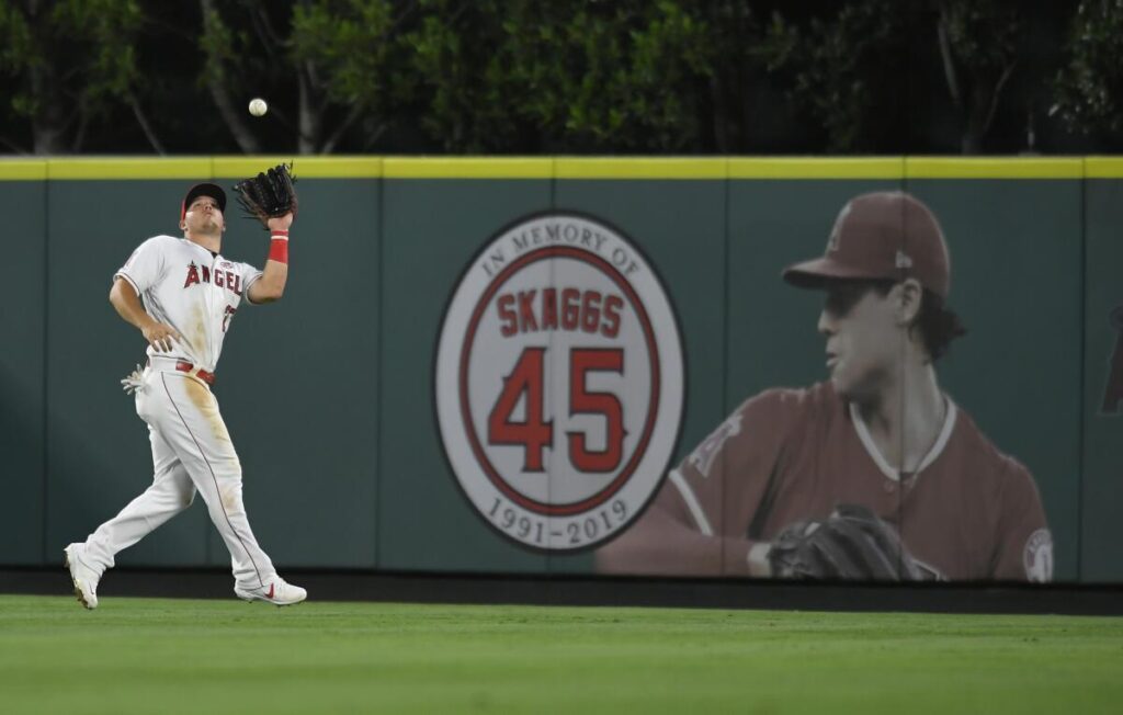 Angels outfielder Mike Trout catches a fly ball in front of graphic honoring the life of Tyler Skaggs at Angel Stadium in 2019.
