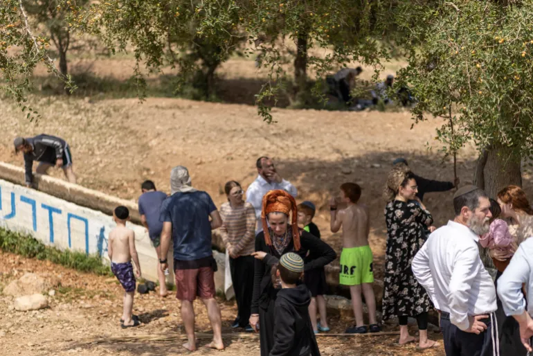 Israeli settlers stand at a water slide in the Israeli-occupied West Bank village of Ras Ein al-Auja on April 9, 2026 [Ilia Yefimovich/AFP]