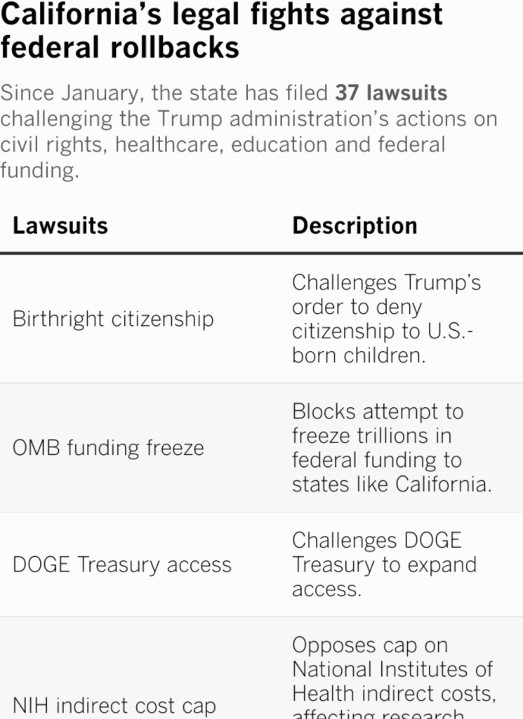 Bonta’s report outlined 36 lawsuits his office had brought against the Trump administration through Wednesday. Those lawsuits challenged Trump’s efforts to slash the federal workforce, cut healthcare funding and research, dismantle the Department of Education and reduce education funding. They also challenged Trump administration efforts to end birthright citizenship for the U.S.-born children of undocumented immigrants and restrict voting access in California, among other things.