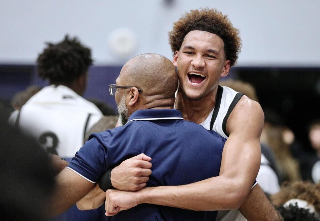 Sierra Canyon’s Maximo Adams hugs coach Andre Chevalier.