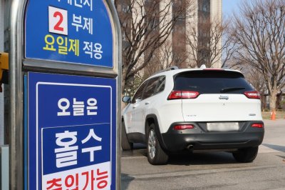 A car drives past a sign reading ‘cars with even-numbered plates are not allowed to be driven for the day’ in Seoul, South Korea, 17 March 2026. The government invoked emergency measures against severe fine dust, implementing an alternate-day driving system for public agencies and limiting the operation of coal-fired power plants and high-emission state facilities. Photo by YONHAP / EPA