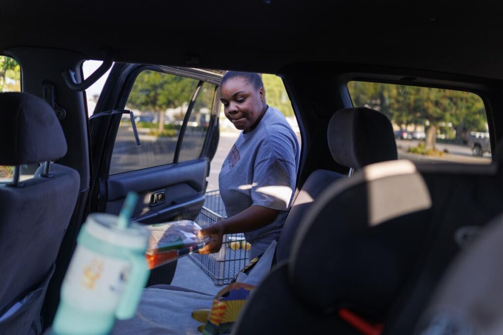 Zuir Crawford, 20, loads groceries bought using gift cards supplied by Riverside City College.