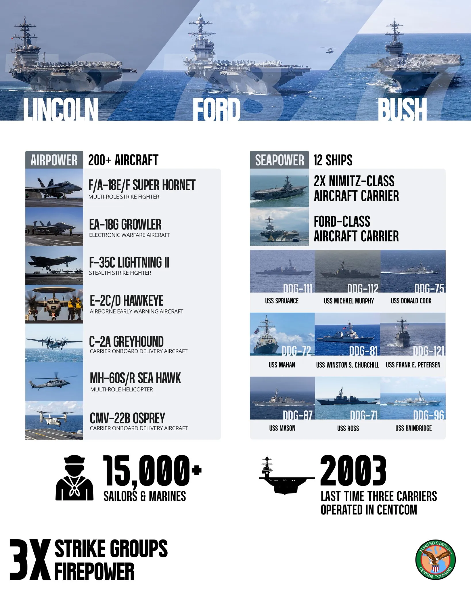 The George H.W. Bush CSG arrived in U.S. 5th Fleet’s area of responsibility last week, becoming the third U.S. aircraft carrier operating in the Middle East. According to U.S. Central Command (CENTCOM), this is the first time since the 2003 Iraq War that the U.S. has triple-carrier coverage in the region. Outside the Gulf of Oman, the Abraham Lincoln CSG and Tripoli ARG are operating in the Arabian Sea, supporting blockade measures. The Gerald R. Ford CSG remains on station in the northern Red Sea, satellite imagery shows.