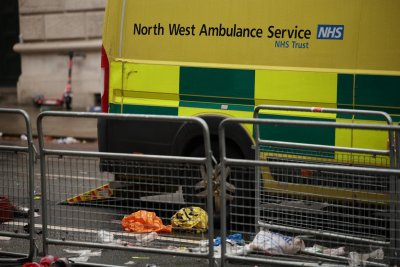 Rescue crews attend to victims after a man rammed a crowd gathered for a victory parade for the Liverpool FC soccer team in Liverpool on Monday. Photo by Adam Vaughan/EPA-EFE