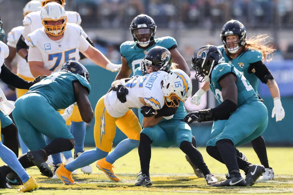 The play had been whistled dead — left tackle Trevor Penning was lined up wrong — but that didn’t stop Jaguars defensive end B.J. Green from racing around the edge and obliterating the star quarterback. The Chargers didn’t even get the benefit of the roughing-the-passer call, as the penalties were offsetting.