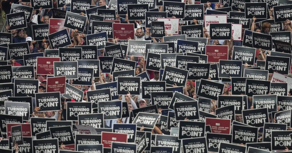 “Charlie’s having some serious heavenly FOMO right now,” Turning Point Chief Executive Tyler Bower said, likening the moment to bringing “the Holy Spirit into a Trump rally.”