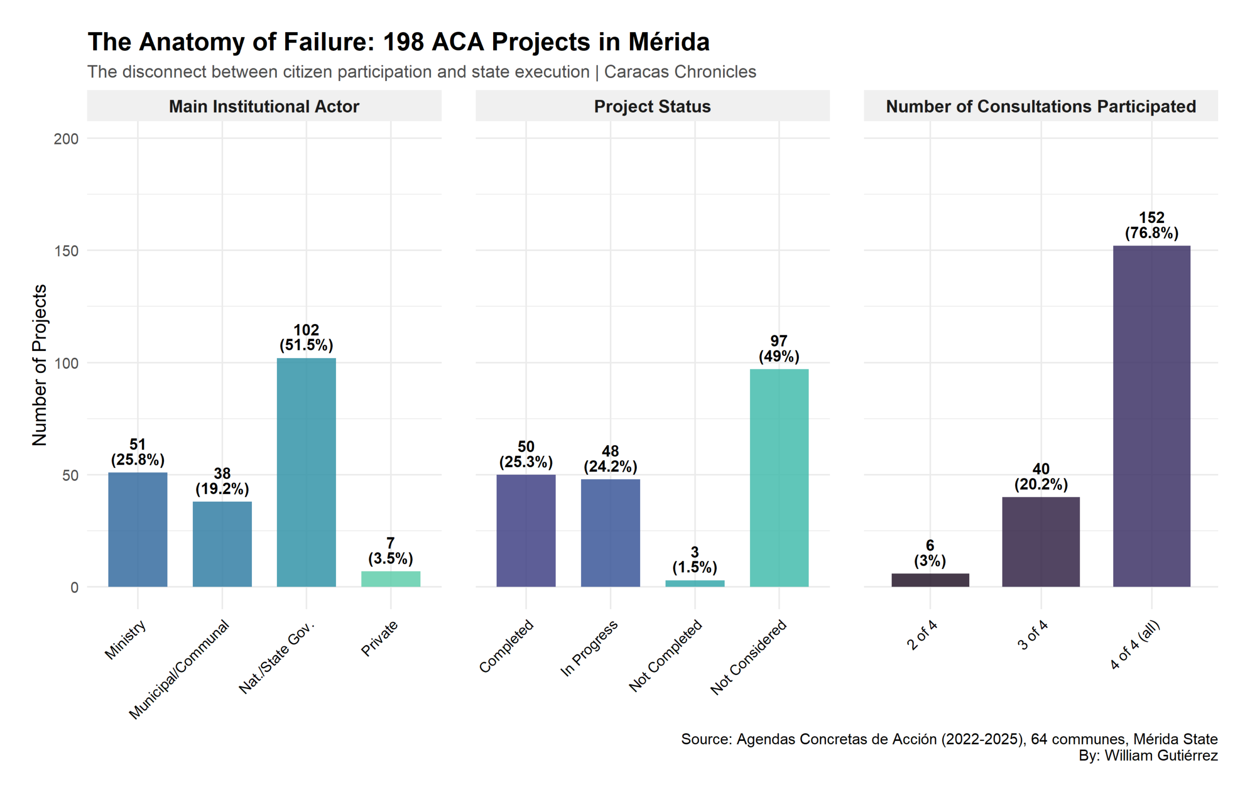First of all, who decides: of the 198 projects, 51.5% (102) were assigned to ministries and the national government for implementation, while another 25.8% (51) fell to the Mérida governorship. The communes diagnose the needs, but Caracas decides whether to open or close the tap of resources. Only 19.2% (38 projects) remained under municipal or communal control.