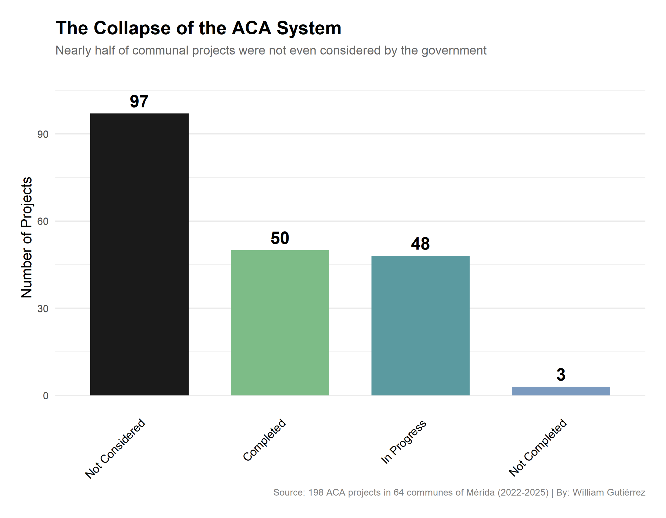 Between August and July 2025, I did an internship at the National Institute of Statistics. There, I was able to review the records of 198 projects from the Concrete Action Agendas (ACA in Spanish) in 64 communes in the state of Mérida. The ACAs are the central mechanism of the chavista Communal State for participatory planning: consultations in which the communes identify their priority problems (called “critical nodes”) and vote on the projects they want the State to implement. These 64 communes represented 82% of the 78 registered in the state. The remaining 14 were excluded from the analysis because the officials responsible for transcribing the community assessments into the databases made so many errors that the information was unusable.