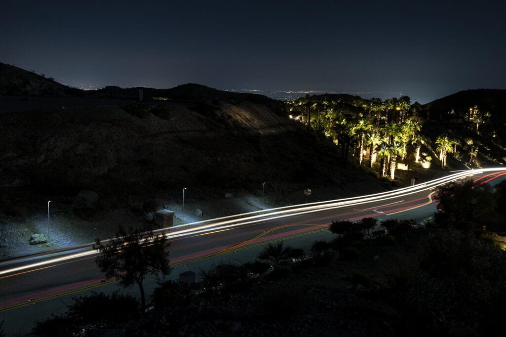 A cluster of palm trees light the evening landscape on Frank Sinatra Drive in Rancho Mirage.