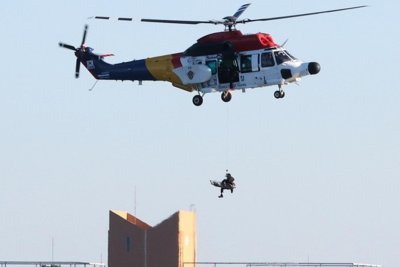 A member of the Korea Coast Guard (KCG) rappels from a helicopter toward a ferry in waters off the National Maritime Museum of Korea, in the port city of Busan, South Korea, 21 November 2025. The Korea Coast Guard conducted a disaster drill simulating a ferry fire and subsequent rescue operations. File. Photo by YONHAP / EPA