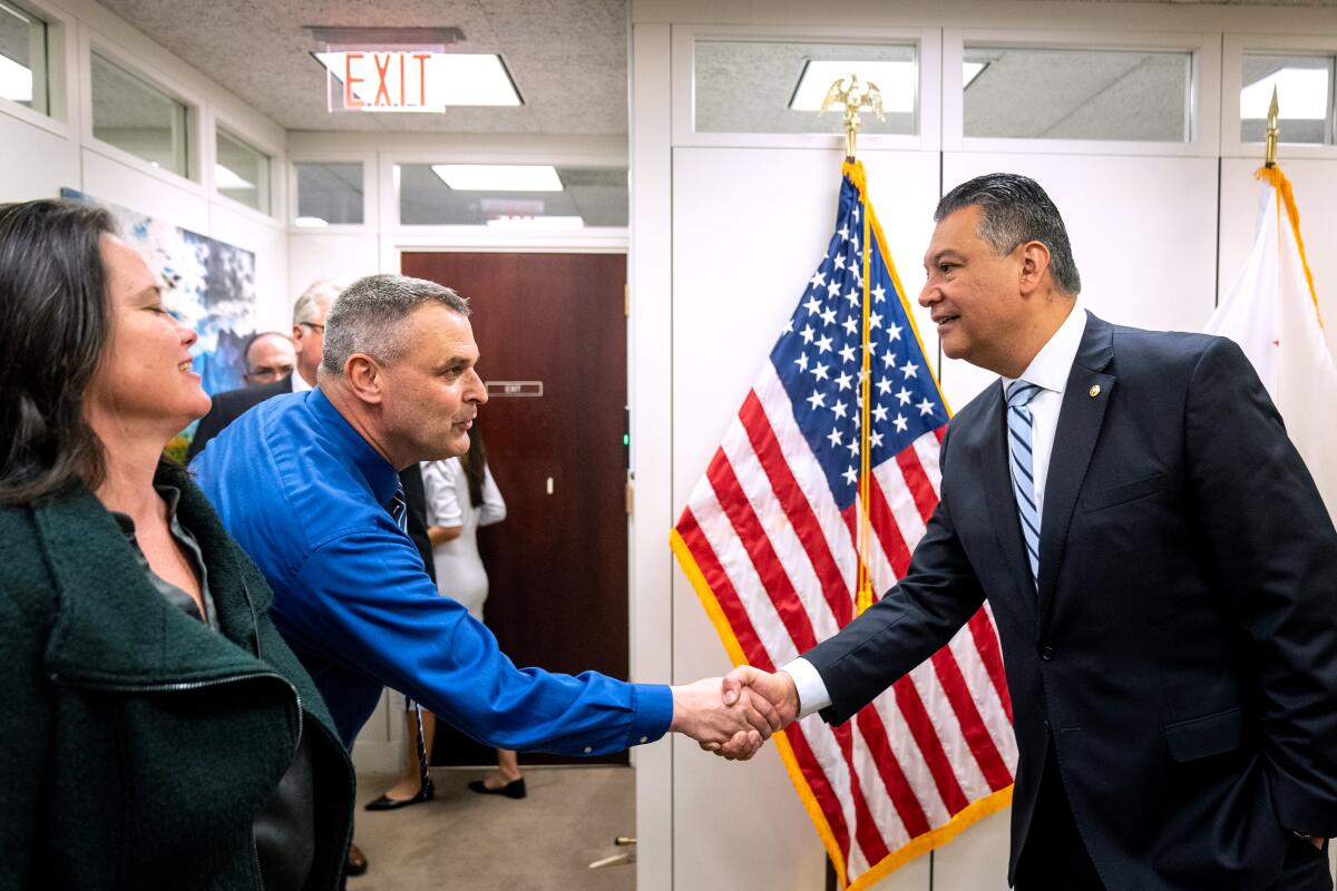 Sen. Alex Padilla (D-Calif.), greets Supts. Jaime Green, of Weaverville, and Anmarie Swanstrom, of Hayfork, on Capitol Hill in February 2023.