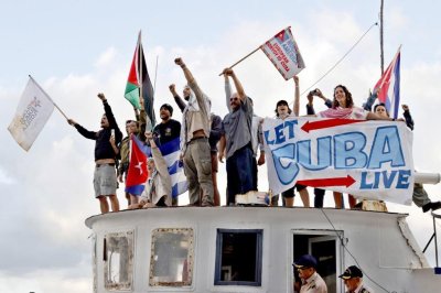 Members of the Nuestra America Convoy wave as they arrive at the port in Havana on Tuesday. The convoy, inspired by the Global Sumud Flotilla that delivered humanitarian aid to Gaza in 2025, aims to send a message of political support to Cuba, which has been subject to a U.S. oil embargo since January. Photo by Ernesto Mastrascusa/EPA