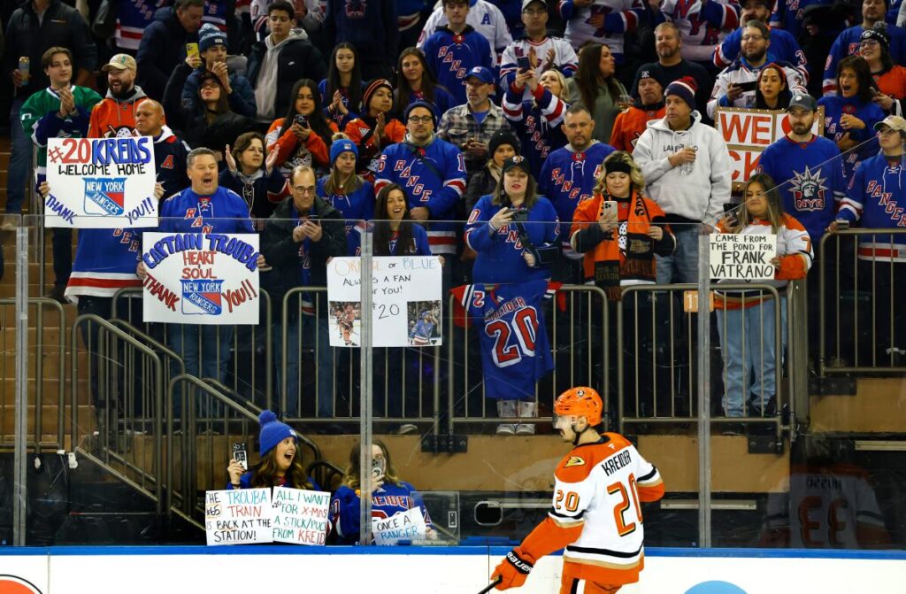 New York Rangers fans welcome Ducks forward Chris Kreider back to Madison Square Garden before the start of the Ducks’ 4-1 win on Monday night.