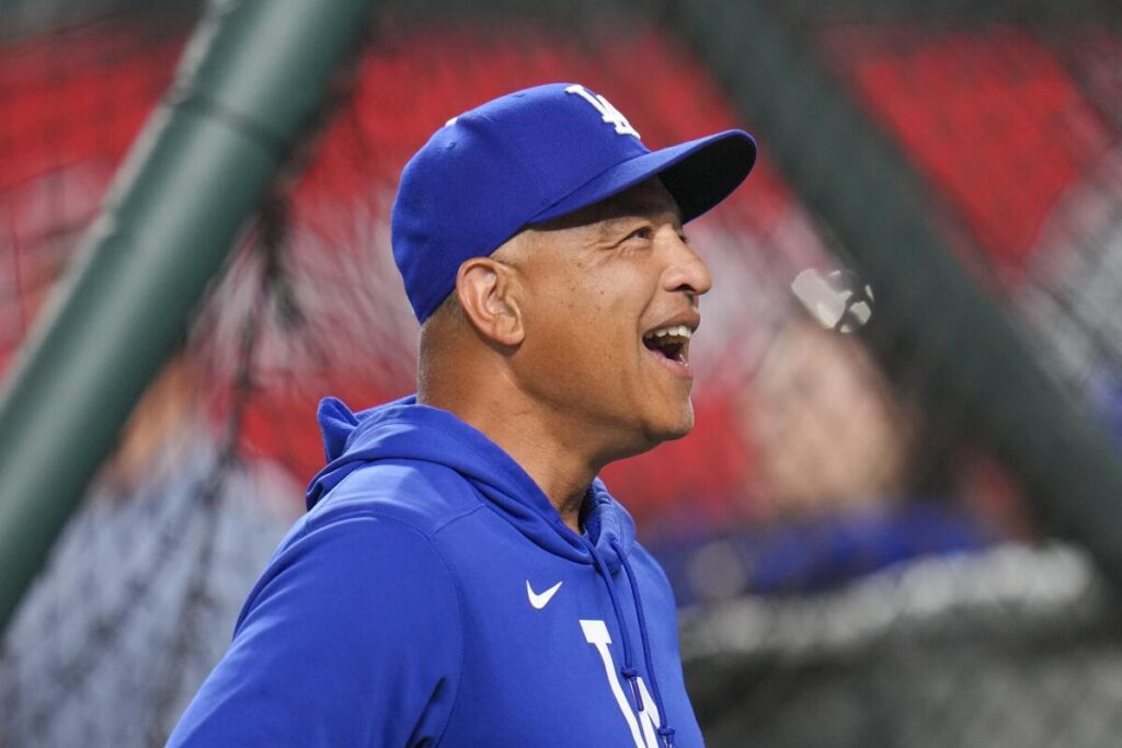 Dodgers manager Dave Roberts smiles before a game against the Texas Rangers in April.