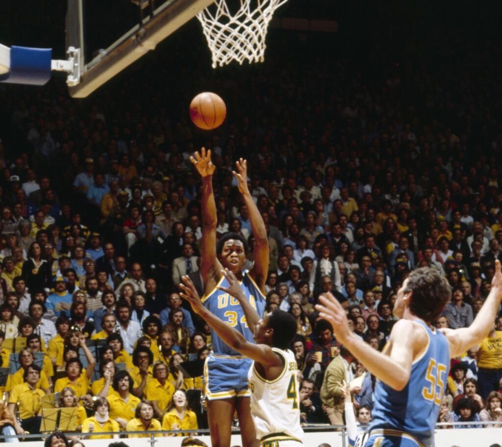 UCLA’s David Greenwood (34) shoots a basketball during a game against San Francisco at the Marriott Center in Provo, Utah, on March 15, 1979