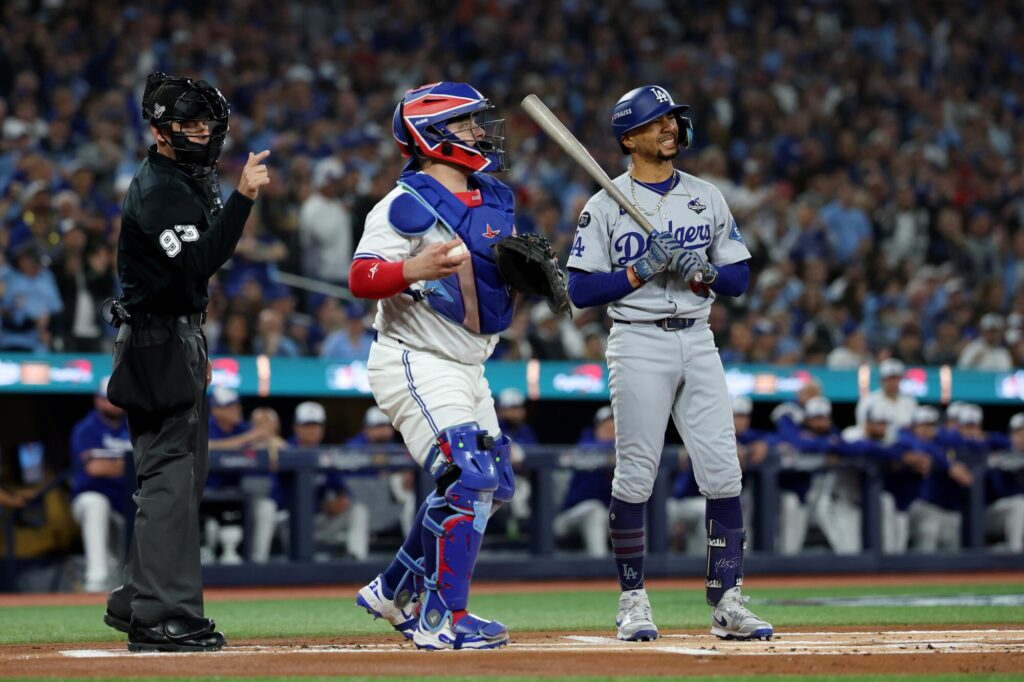 Dodgers shortstop Mookie Betts reacts during an at-bat in the first inning against the Toronto Blue Jays in Game 1 of the World Series on Friday night.