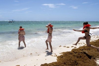 People walk past sargassum clumps on the sand in Punta Cana, Dominican Republic, in July. File Photo by Orlando Barria/EPA
