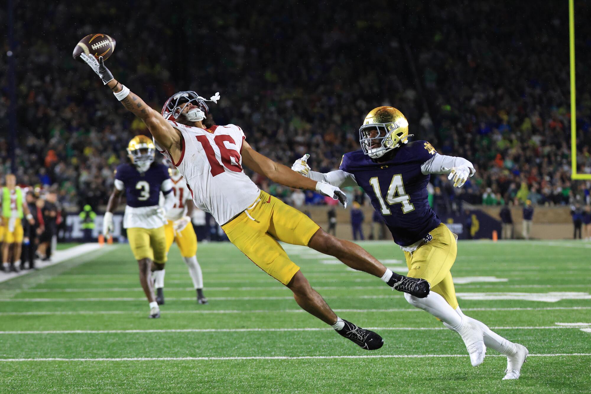 USC receiver Tanook Hines attempts to make a catch under pressure from Notre Dame’s Dallas Golden at Notre Dame Stadium on Oct. 18.
