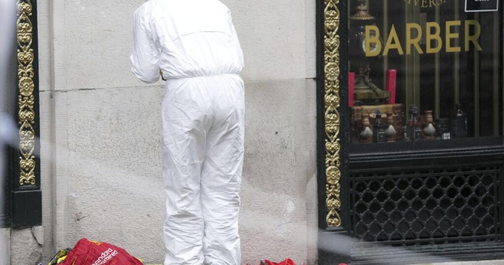 Teams of officers wearing white forensic suits scoured the damp streets for evidence and snapped photos of clothing and other items left behind as people fled the chaotic scene.