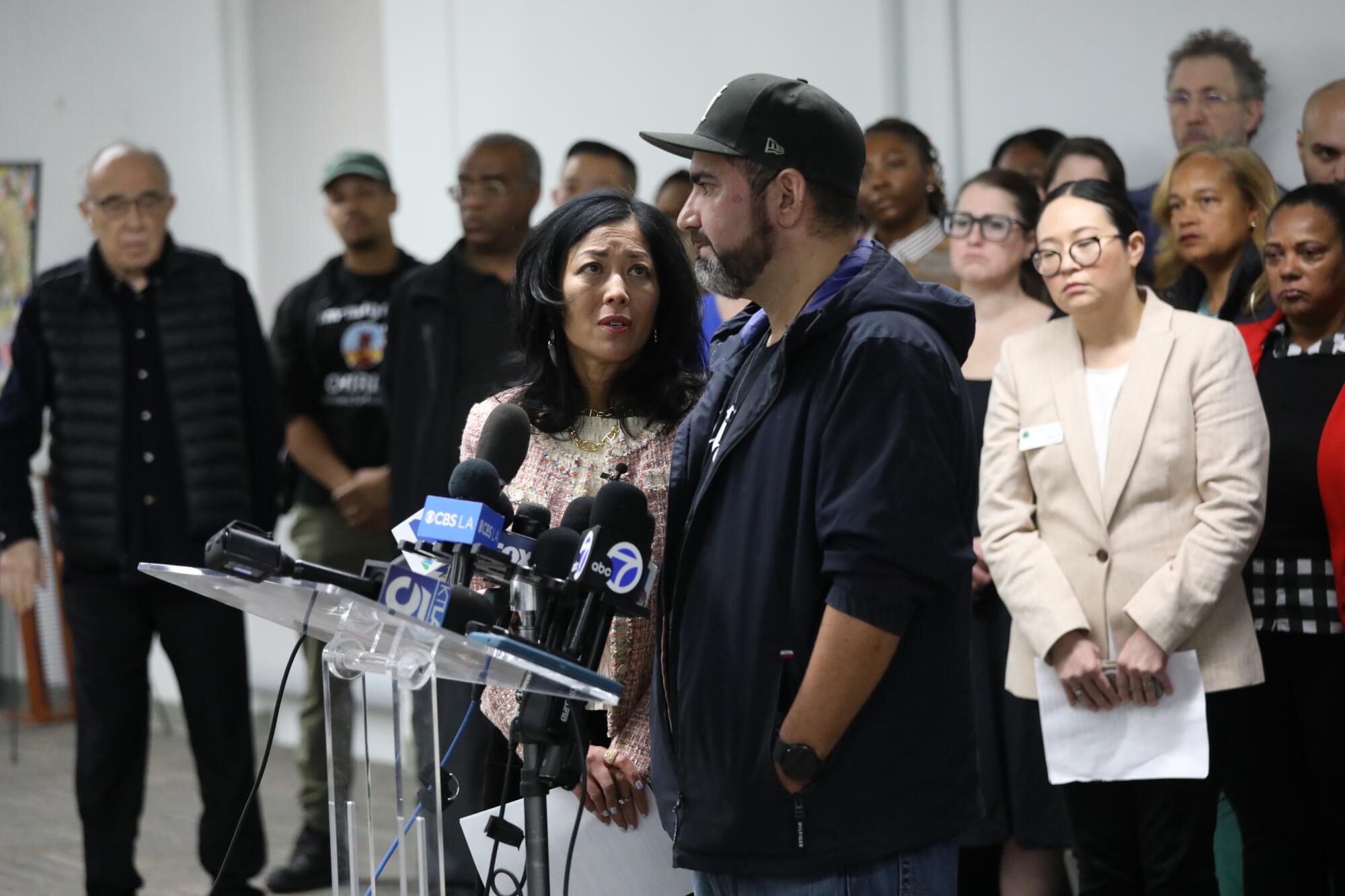 Gabriel Gonzalez, center, an Eaton Fire survivor, shown with Joy Chen, Executive Director of the Eaton Fire Survivors Network (EFSN), left, and other survivors at a press conference in Altadena. They urged Southern California Edison to provide urgent housing relief to keep Eaton Fire families housed this winter.