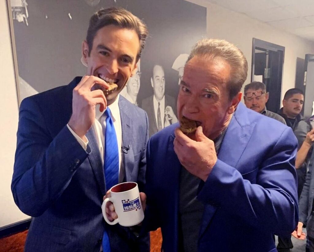 Fox 11 anchor Elex Michaelson and former Gov. Arnold Schwarzenegger eating Michaelson’s mom’s baked good at a prior event.