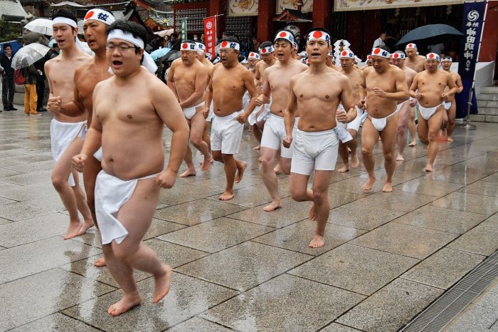 Parishioners perform a ritual before the cold-endurance ceremony Kanchu-Misogi at the Kanda Myojin Shrine in Tokyo on Saturday. Photo by Keizo Mori/UPI | License Photo