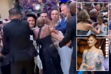 He barges past security and knocks into a cameraman before holding onto Ariana – who appears shaken by the exchange.