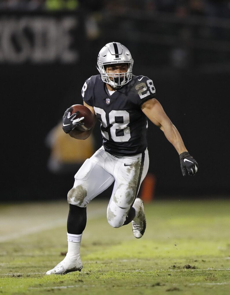 Oakland Raiders running back Doug Martin (28) carries the ball during a game against the Denver Broncos in Oakland on Dec. 24, 2018.