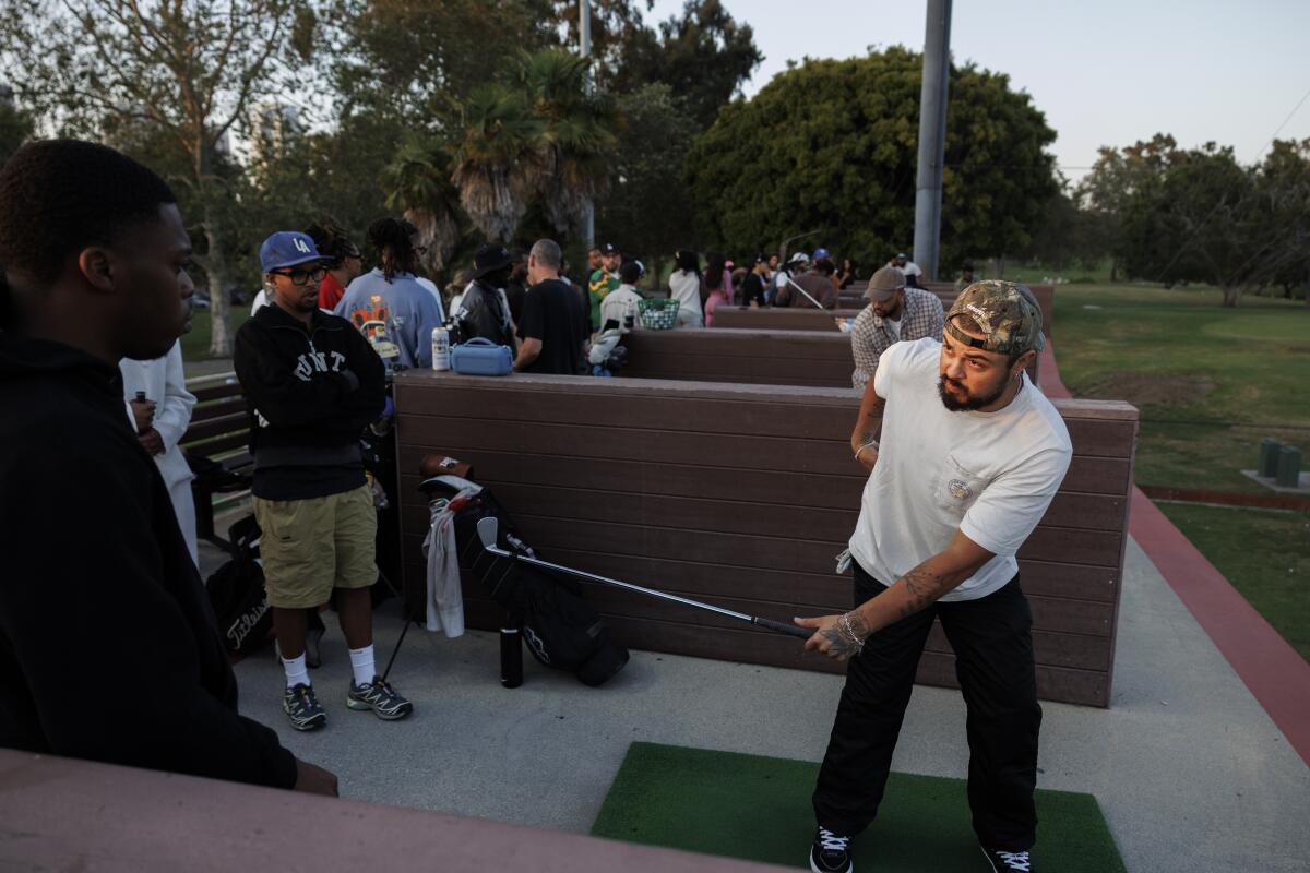 Blaise Butler of Los Angeles sets up a golf ball on the tee, left, while attendees pose for photos. Swang’s Instagram bio reads that it’s a community for those “who were never invited — but always belonged.”