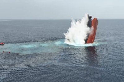 1 of 2 | A screen grab taken from a handout video released by the Houthis military media center on 09 July 2025 shows the Liberian-flagged bulker, Eternity C, sinking after being attacked in the Red Sea off the port city of Hodeidah, Yemen. File Photo by Houthis Military Media Center/EPA