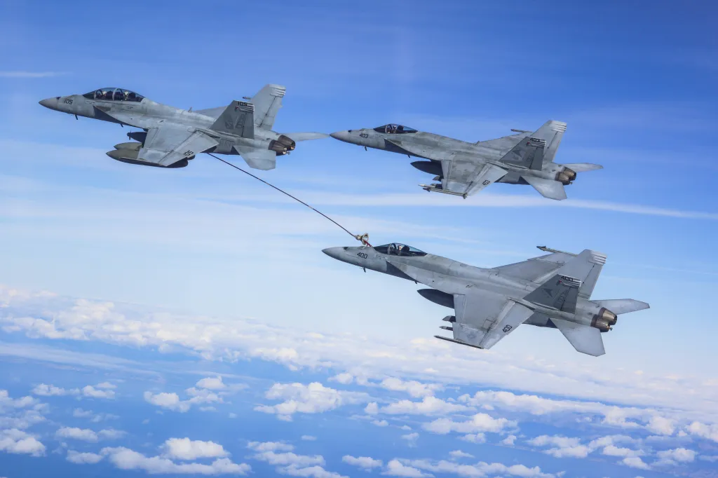 220122-N-NO874-1009 MEDITERRANEAN SEA (Jan. 22, 2022) An F/A-18F Super Hornet, attached to the “Red Rippers” of Strike Fighter Squadron (VFA) 11, refuels an F/A-18E Super Hornet, attached to the “Sunliners” of Strike Fighter Squadron (VFA) 81, Jan. 22, 2022. The Harry S. Truman Carrier Strike Group is on a scheduled deployment in the U.S. Sixth Fleet area of operations in support of naval operations to maintain maritime stability and security, and defend U.S., allied and partner interests in Europe and Africa. (Photo courtesy of Strike Fighter Squadron 11)
