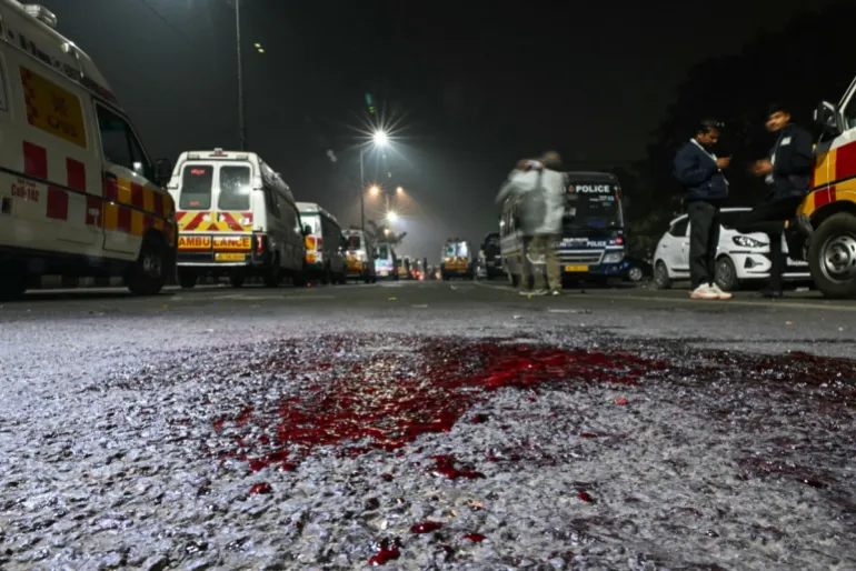 Ambulances are kept on standby on a blood-spattered road at the blast site after an explosion near the Red Fort in the old quarters of Delhi on November 10, 2025. At least 13 people were killed and 19 injured when a car exploded in the heart of the Indian capital, New Delhi’s deputy fire chief told AFP [Sajjad Hussain/AFP]