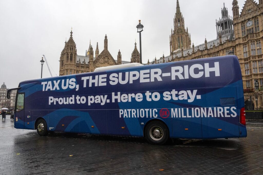 A bus in London promotes a campaign by British millionaires advocating for an end to extreme wealth and inequality.