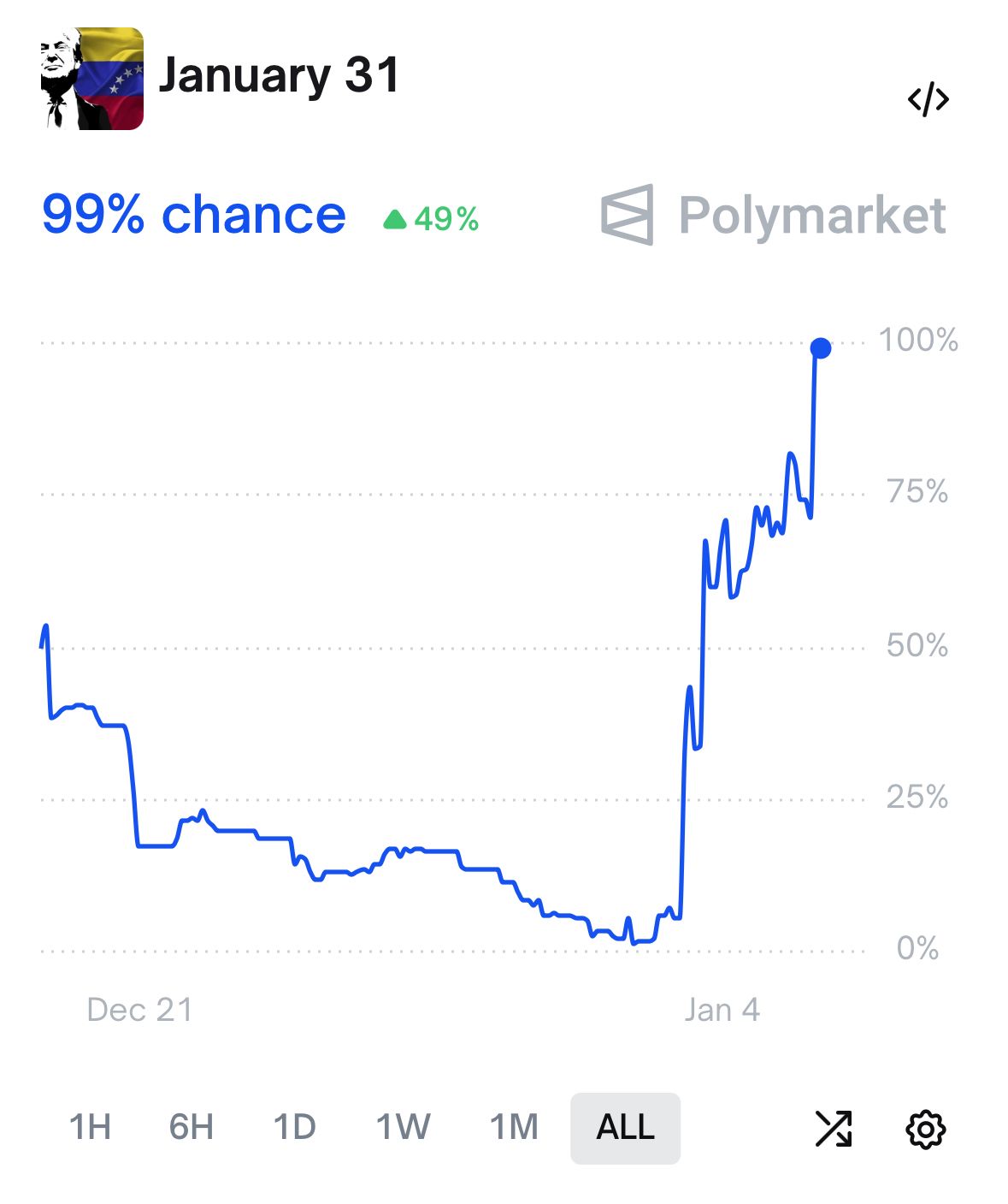 Now, Polymarket shows a sudden, overnight repricing of almost 100%, as if someone had entered the market with new information. Prediction markets can move on leaks or real inside signals. In other words: does someone know something and wants to profit out of it? Does it flag imminent action? The next few days will tell, but with confidence it is almost a certainty that Trump will request (or invoke!) such powers.