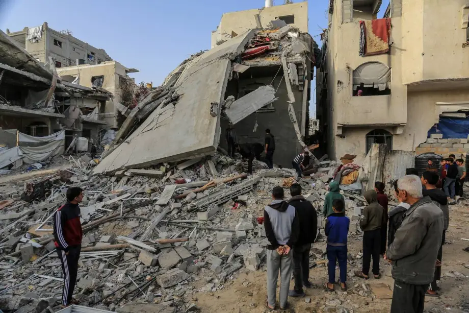 A general view of the completely collapsed building belonging to the Abdulhadi family after an airstrike carried out by the Israeli military as residents examine the rubble of the building and search for usable items in the southern Gaza Strip city of Khan Yunis, on April 06, 2025 [Abed Rahim Khatib – Anadolu Agency]
