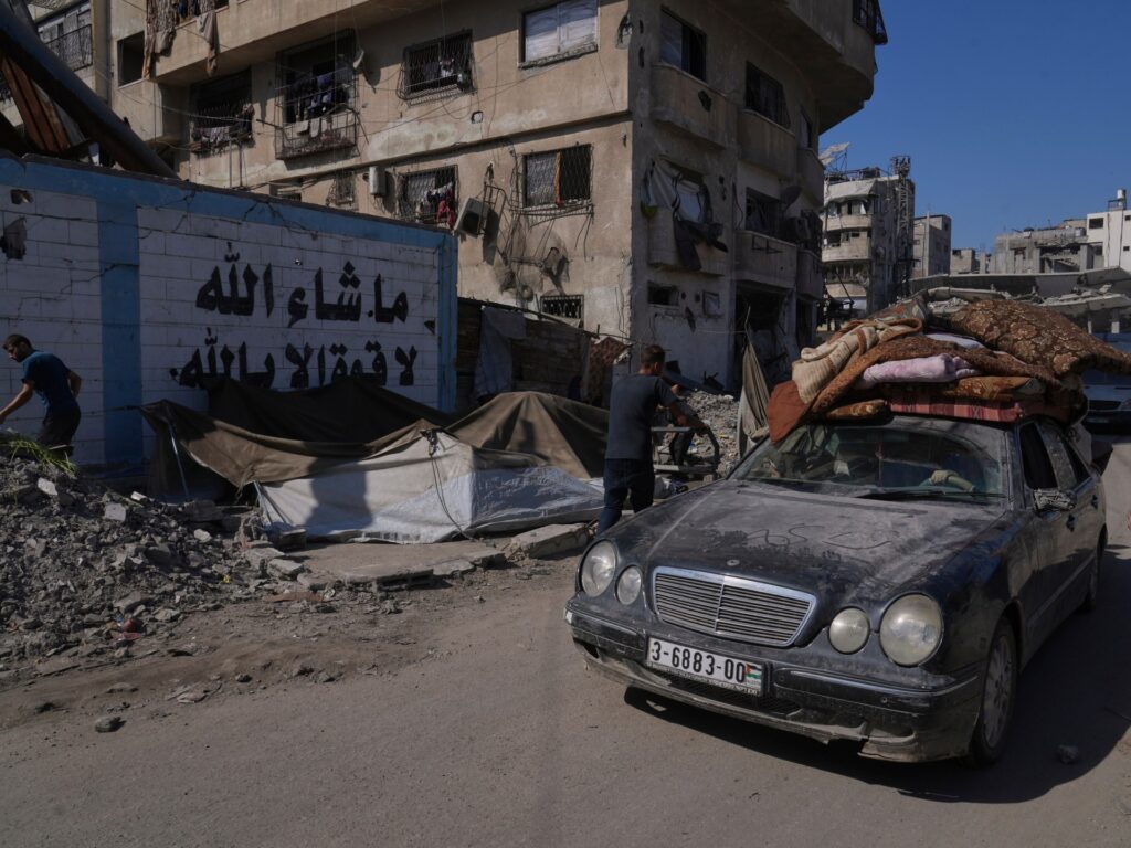 Displaced resident Ahmed Moqat said he had been moving constantly to escape Israeli attacks. “Here’s the debris that fell last night next to my head,” he said. “Now I will go out in the street, only God knows where I will go.”