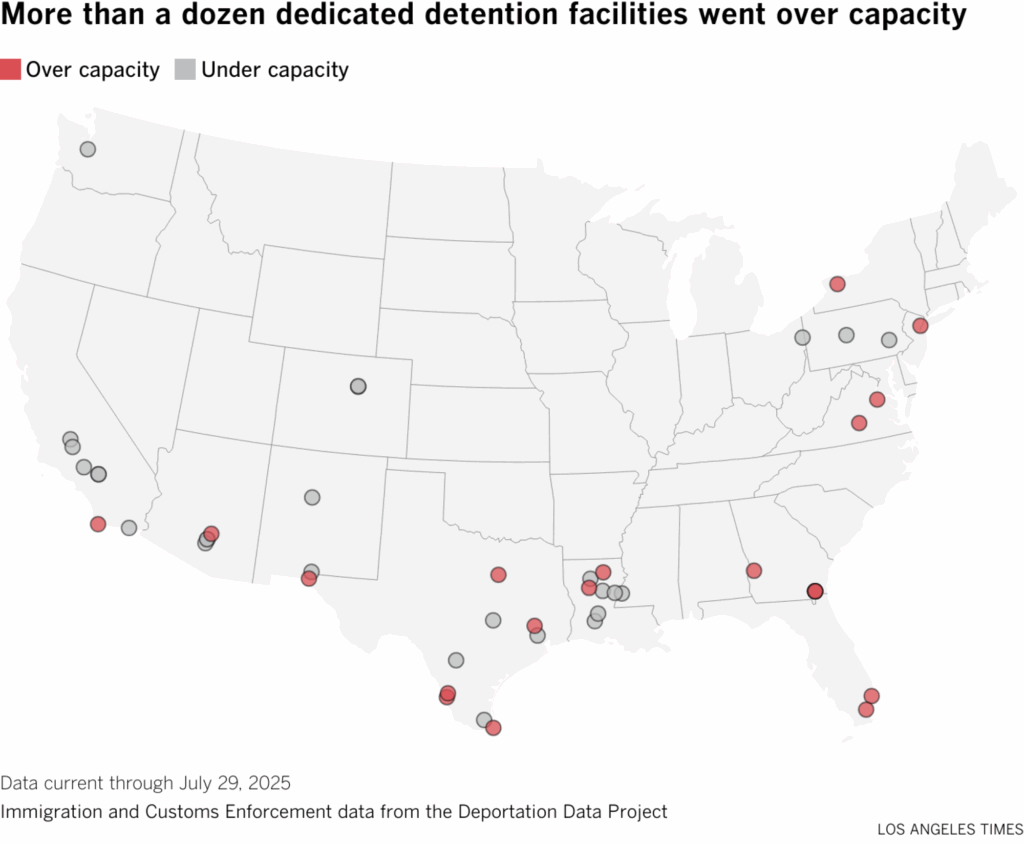 These are some of the conditions described by lawyers and the people held at immigrant detention facilities around the country over the last few months. The number of detained immigrants surpassed a record 60,000 this month. A Los Angeles Times analysis of public data shows that more than a third of ICE detainees have spent time in an overcapacity dedicated detention center this year.