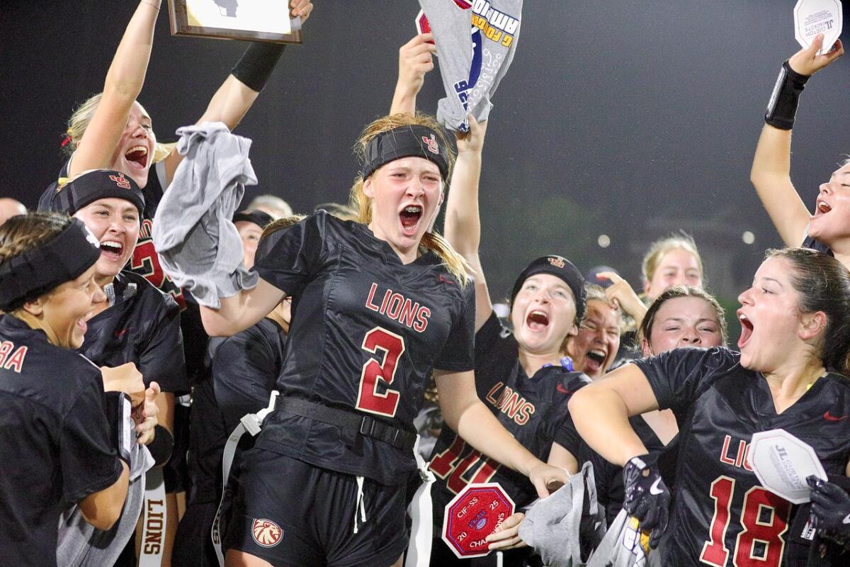 Ava Irwin (2) celebrates with her teammates after catching two touchdown passes in JSerra’s 25-20 victory.
