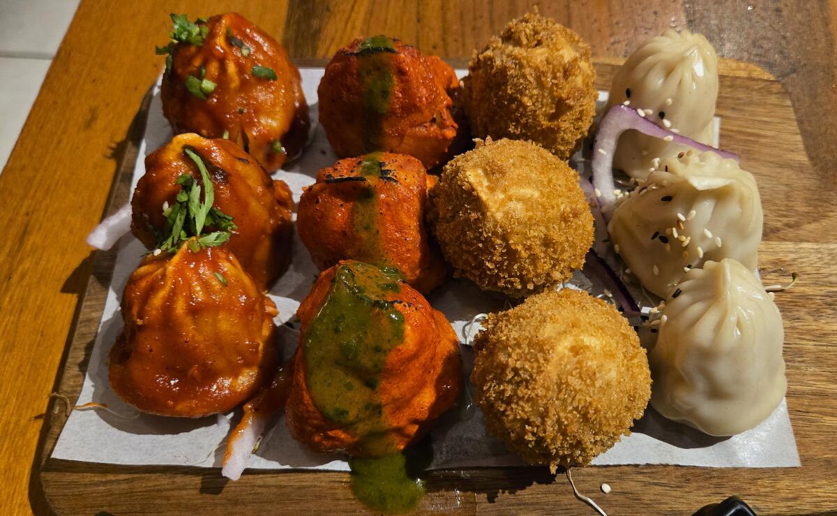 The momo platter from Momo Ghar in Toronto. From left to right, the chili momo tossed in a spicy, savory sauce; the tandoori momo; the kurkure (breaded) momo; and the steamed momo.